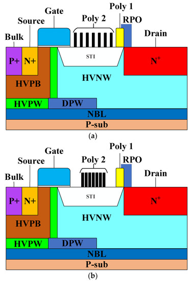 Cross-sectional views of the high-voltage nLDMOS (a) S2_1.4 and (b) S2_0.6 devices.
