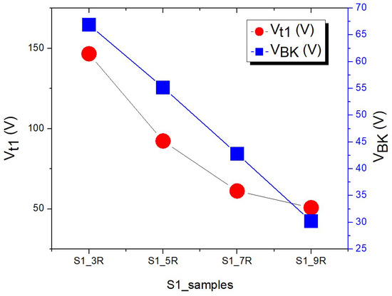 Group 1 samples (S1) pertain to the adjustment of the number of turns of the fixed area; previous studies have focused on directly reducing or increasing the number of turns and have reported that a greater number of turns results in a stronger field plate effect. However, this finding indicates the presence of two variables, and whether the stronger field plate effect was due to an increase in the occupied area or the number of turns is unclear. Therefore, in the present experiment, the area occupied by the sum of the turns was fixed to exclude the effect of changing the area occupied and to clarify the effect of changing the number of turns on ESD capability. Table 1 presents the data for the S1 injection current 1 × 10−4 (A). The table reveals that the trigger voltage (Vt1) tended to increase when the number of turns was reduced; this occurred because we used the field plate effect to reduce the strength of the electric field in the channel, which made it more difficult for components to conduct electricity and caused Vt1 to increase. Figure 7 presents the Vt1 and VBK trends of the S1 samples. S1_3R (i.e., fewest number of turns) had the highest Vt1 of 146.6 V, and S1_9R had the lowest Vt1 of 50.8 V. When the Vt1 increased, the VBK also increased, with the highest and lowest VBK of 69.9 and 30.2 V being achieved with S1_3R and S1_9R, respectively. The lattice temperature floated at 725 K, indicating that changing the number of turns did not cause the lattice temperature to change.
