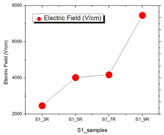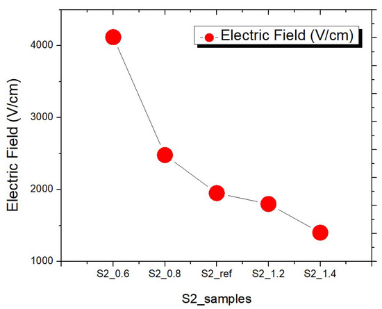 The collected data indicated that the electric field started to weaken when the width increased and the star point EF of the reference group (S2_ref) was 1.95 × 103 V/cm. After the width was reduced, the star point EF was 4.12 × 103 V/cm at the smallest width of 0.6 µm (S2_0.6). The star point EF was 2.48 × 103 V/cm for S2_0.8. The star point EF of S2_1.2 was 1.8 × 103 V/cm at the widest width of 1.2 µm (S2_1.2). The star point EF at the widest width of 1.4 µm (S2_1.4) was 1.4 × 103 V/cm. Figure 10 presents the star point EF comparison of S2 samples.