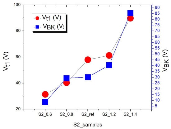 Group 2 samples (S2) pertain to the width adjustments for each turn. In contrast to the previous section, where the area occupied was fixed, the number of turns was fixed in S2 to clarify how increasing the occupied area affected the ESD components. Table 2 presents the data for the S2 injection current 1E-4A. The table reveals that the Vt1 increased when the turn width was increased. This likely occurred because an increase in the area occupied created a stronger field plate effect, which made it more difficult for the components to conduct electricity and caused the Vt1 to increase. The Vt1 was 89.8 V at the widest width of 1.4 µm (S2_1.4). The Vt1 of the reference group was 57.94 V when the width was 1 µm (S2_ref); this value differed from that of the reference group in the previous section. This could have occurred because increasing the width to 1.4 µm caused overlapping with the poly-1 layer to the right. Thus, shifting the floating poly to the left by 1 µm caused the value of the reference group to deviate. When the width decreased to 0.6 µm (S2_0.6), the Vt1 also decreased to 31.4 V. The VBK also changed when the Vt1 changed. When the width was 1.4 µm (S2_1.4), the VBK was 85.5 V, and the Vt1 of the reference group (S2_ref) was 30.2 V. At the narrowest width of 0.6 µm (S2_0.6), the Vt1 decreased to only 8.7 V. Figure 9 presents Vt1 and VBK trends of the S2 for each device when the lattice temperature was maintained at 725 K. Furthermore, the lattice temperature was not affected by adjustments to the width of the aforementioned section.