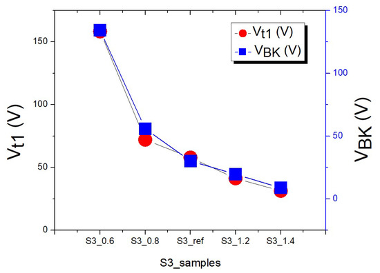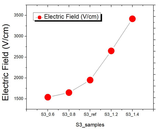 With respect to the electric field values, the reference group (S3_ref) produced a 1.95 × 103-V/cm electric field, which corresponds to the values reported in the previous subsection, and reducing the pitch caused the electric field to weaken. With a pitch of 0.6 µm (S3_0.6), the star point EF was 1.54 × 103 V/cm. With a spacing of 0.8 µm (S3_0.8), the star point EF was 1.65 × 103 V/cm. When the spacing was increased, the electric field increased in strength. With a spacing of 1.2 µm (S3_1.2), the star point EF was 2.56 × 103 V/cm. With a spacing of 1.4 µm (S3_1.4), the star point EF was 3.42 × 103 V/cm. Figure 12 presents the star point EF comparison of the S3 samples, which reveals that an increase in the spacing reduced the field effect, resulting in higher field values and lower VBK values.