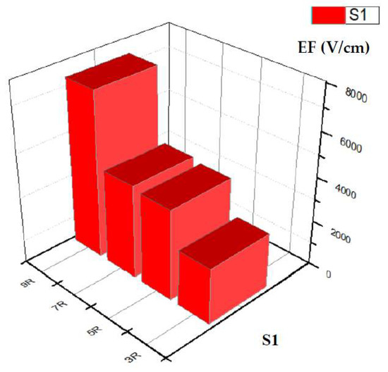 Therefore, we have fixed the number of turns for S2 and S3 to investigate the effect of width and pitch on the protection capability. The EF field values for S2 (width adjustment) and S3 (pitch adjustment) are plotted in Figure 14, which shows that the wider the width, the lower the field, and the greater the pitch, the higher the field. Therefore, the higher the width of the protection element and the lower the spacing, the greater the reduction in the electric field (EF) value.