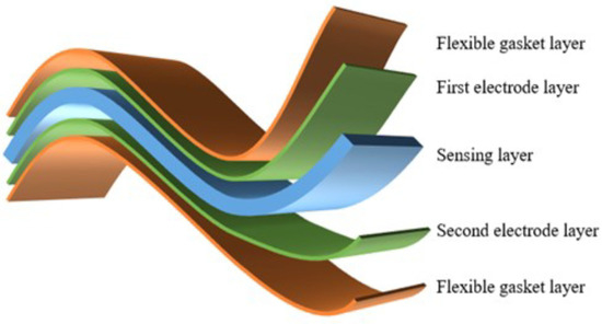Resistive sensors transform non-electrical variations into changes in resistance by modifying the shape of a stress-sensitive elastic conductor. The typical structure of a resistive sensor, illustrated in Figure 4, includes a flexible contact layer for the first and fifth layers, a first electrode layer and a second electrode layer for the second and fourth layers, respectively, and a sensing layer typically positioned in the middle as the third layer. Compared to other sensor types, resistive sensors have garnered significant attention due to their high sensitivity, wide measurement range, excellent reusability, and simple structure, making them a primary focus of research.
