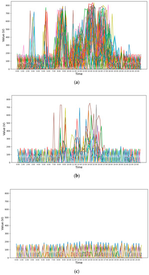 Figure 2 shows the power consumption data measured in 15 min increments per day, consisting of a total of 96 data measurements from 00:00 to 23:45. Figure 2a shows weekday data (Mon–Fri), Figure 2b,c show Saturday and Sunday data, respectively. Table 1 shows configuration information for the ensemble models and Table 2 shows different patterns between classes (i.e., Class1: Weekday, Class2: Saturday, Class3: Sunday). In the case of Class1, this showed power use staying at 200 and then suddenly rising. This was because the door of the refrigerator was opened. When the door of a refrigerator is opened, cold air is discharged, and the refrigerator uses more power to cool again. In this paper, the part where power consumption increases rapidly due to the opening of the refrigerator is called a peak spot. In the case of Class2, this showed that power usage stayed at 200 and sometimes rose suddenly. This was because Class2 opened the refrigerator door less frequently than Class1 due to the characteristics of the day of the week. In conclusion, Class2 had fewer peak spots than Class 1. In the case of Class3, the power consumption data were mostly around 200. This means that the refrigerator door was not opened in Class3. Characteristically, Class3 had no peak spot. In conclusion, we confirmed that there was an interclass seasonality and an inherent periodicity of the class. Note that the classification accuracy can be improved with time series prediction approaches due to inherent periodicity and seasonality. Therefore, we proposed a way to predict power usage by dividing it into three classes: weekly, Saturday, and Sunday.