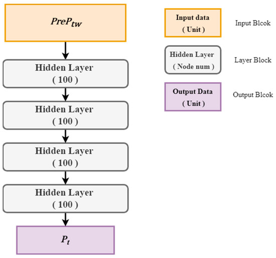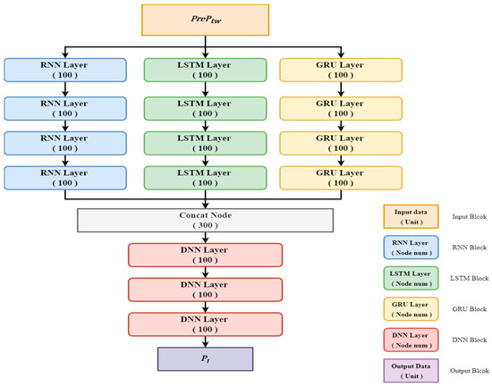 PrePt,w is input into the time series models to predict the power usage Pt at time t. The input value is vectorized through four hidden layers. We combined the resulting vectors through the time series prediction methods into one vector and then predicted the Pt through the DNN layer.