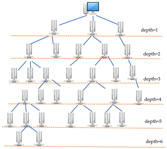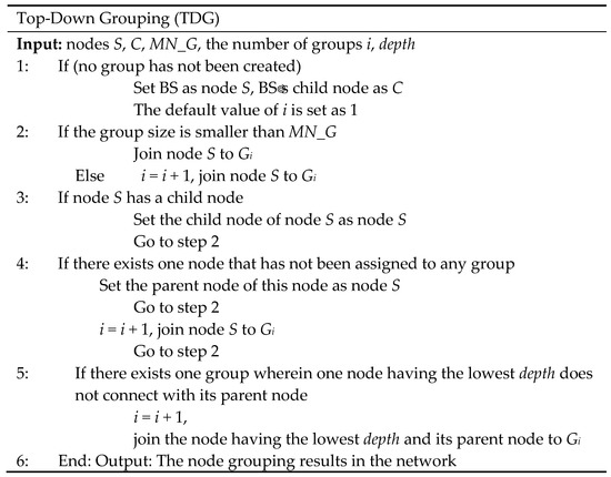 In TDG, a breadth-first search starts from BS (Figure 3). If the number of nodes joining the group equals the maximum number of group members, the search stops, and the group is completed. The node with the lowest depth in a group is delegated as the root of the group, and the search restarts from the deepest node to its child node. The above process continues until all sensor nodes are assigned to a group, and all groups can connect with other groups via a shared node. Considering the tree topology in Figure 4 as an example, we assume a maximum number of group members of six. With TDG, the entire network can be divided into eight groups.