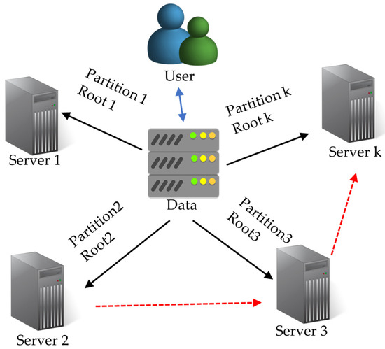 Each root in Equation (2) represents a partition. Based on [12], all partitions must be acquired to perform the calculation in Equation (3) to recover the original data (key). Parakh [12] found the roots in polynomials over a finite field (which was a large prime number), as presented in Equation (1), where there are a total of n roots. To utilize it in encryption algorithms, transformation to a finite field is carried out based on Equation (2). Subsequently, the data is substituted in Equation (1), and k roots (r1…rk) are obtained. Each root is referred to as a partition, and the partitions are randomly distributed among various network servers. Only the owner is aware of the storage locations of the partitions, and to access them, one must know the server’s password (the password for accessing the server and not the data password). Notably, all partitions are required to recover the original data. Figure 2 illustrates the concept of data partitions. To recover the original data, the partitions are multiplied as presented in Equation (3). Thus, these pieces can be stored randomly on different network servers.