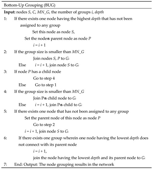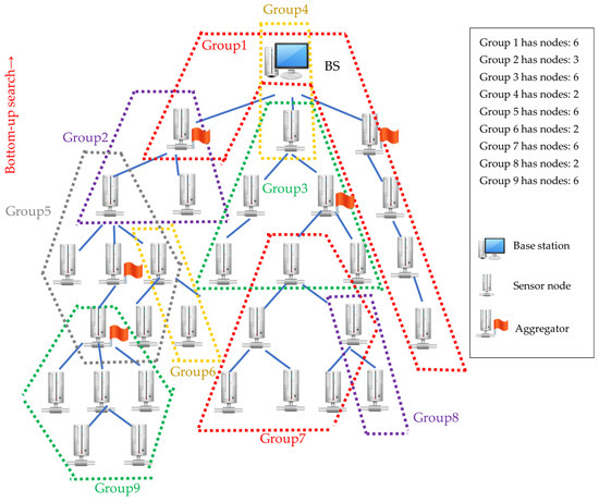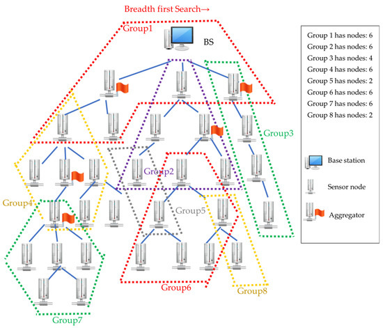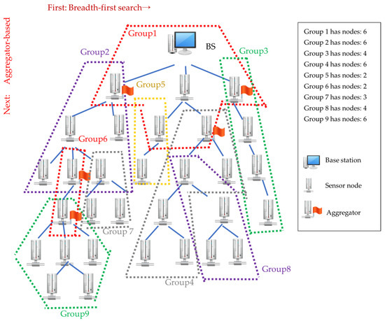 To integrate the aggregation and encryption functions more effectively, we propose an alternative grouping algorithm, ABG (Figure 7). The breadth- and left-first searches start from BS to its child node x. If the number of nodes added to the group is smaller than MN_G, it continues searching for other child nodes of node x. When the aggregator is met, the search is targeted at other child nodes, which are non-aggregators. If the number of nodes added to the group is smaller than MN_G, the search stops, and the group is completed. The node with the lowest depth is delegated as the root of the group, and the search restarts from the deepest node to its child node. This process continues until all sensor nodes are assigned to a group, and all groups can connect with other groups via a shared node. For the previous example, ABG can divide the entire network into nine groups. The grouping results are shown in Figure 8.