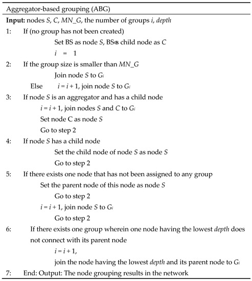 Pseudocode of the aggregator-based grouping (ABG) algorithm.