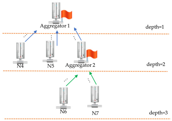 Encryption and decryption follow the same estimation rules. Figure 9 shows the encryption and decryption procedures and how to estimate the number of encryption and decryption operations. Data are transmitted from one sensor node (Node1) to the target node (Aggregator). The data may be transmitted between the nodes from different groups. The data transmitted from Node1 to the aggregator passes through the node from three different groups (Figure 10), and they need three encryptions and two decryptions. We infer that one node transmits data to the aggregator through nodes from different t groups, and t + 1 encryptions and t decryption are needed. The node from the same bottom level (Node6–7) must be aggregated as one aggregator (Aggregator2) using the aggregate function, and the data are encrypted as one data. The aggregator (Aggregator2) transmits the data to the previous level (depth = 2), repeating the aggregation procedure until the data are transmitted to the top level (depth = 1). Thus, one encryption is needed. The aggregator needs to decrypt each child non-aggregator node (green node). If one aggregator has y child non-aggregator nodes, it needs y decryption.
