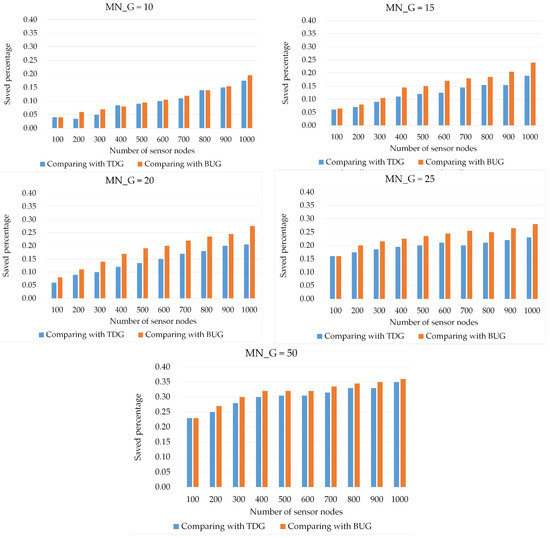 We investigated the influence of encryption and decryption using the group algorithms between different proportions of aggregator nodes, and the results are shown in Figure 12. TDG, BUG, and ABG were used to group 1000 nodes in the network. When a network allows fewer group members, more groups are created. Also, only a few nodes can share the same key in the group; thus, the security level of the entire network can be increased. Contrarily, when a large number of nodes exist in each group, all nodes can share the same key in the group. Thus, the number of encryptions and decryptions can be reduced, but the security level of the network reduces. Therefore, choosing an appropriate MN_G is an important issue when launching WSN applications. Herein, the proposed ABG could further reduce the number of encryptions and decryptions when the percentage of aggregators occupied in the network approached 30% with MN_G = 10, 15, 20, and 25. When the percentage was over 30%, the grouping results for all MN_G values were similar. Thus, the number of encryption and decryption operations was also similar.
