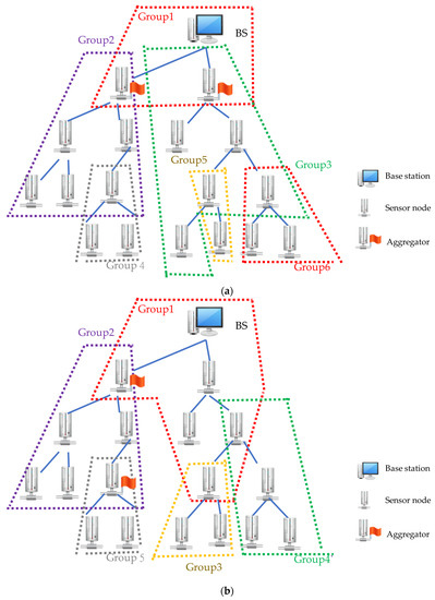 Furthermore, aggregate nodes, which perform aggregation function calculations, have higher power consumption than regular nodes. Accordingly, the base station may designate nodes with sufficient power as new aggregate nodes to maintain the network lifetime. Since our grouping method is based on aggregate nodes, grouping must be performed for the new aggregate nodes, and the group keys for each group are generated according to our key update mechanism.