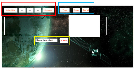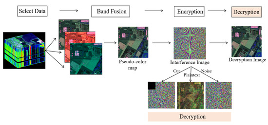 - Data pre-processing module: The red box area can be based on the characteristics of a remote sensing image with multiple bands, and three bands can be selected to synthesize the pseudo-color image after importing the data to obtain the visual information of the image initially. If you want to encrypt a grayscale image, it can directly make the same number in three bands. After the initial image is obtained, the image is encrypted and decrypted directly in order to obtain the encryption and decryption effect more intuitively.