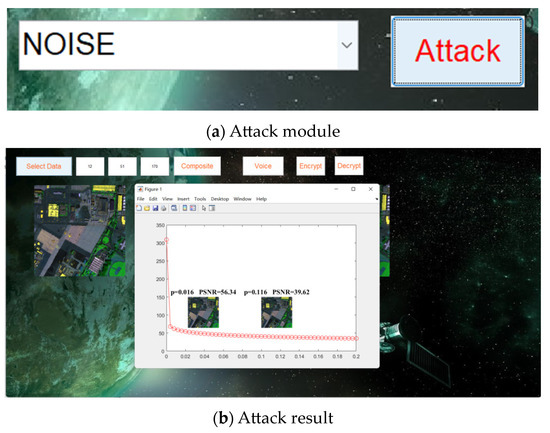 - Attack module: The yellow box area is the attack window and provides multiple attack algorithms and checks the robustness of the algorithm. There are four attack algorithms, namely noise attack, known plaintext attack, selected plaintext attack, and shear attack.
