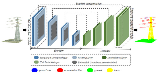 In this section, we first provide an overview of the proposed CA-PointNet++ model’s network architecture, which utilizes an embedded attention mechanism to enhance the accuracy of 3D point cloud segmentation in transmission corridor scenes. Furthermore, we present a detailed description of the CA module’s structure as well as the specific structure and implementation process of incorporating the CA module into the PointNet++ model to form the CA-PointNet++ model.