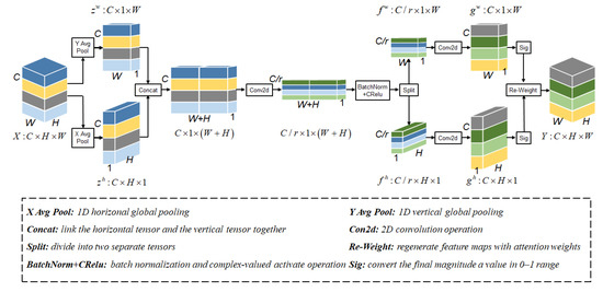Given an input feature map , where H, W, and C represent the height, width, and number of channels, respectively, the CA module computes a set of spatial coordinates as follows: The CA module first considers embedding coordinate information by using two one-dimensional global pooling operations to encode each channel of the input along the vertical and horizontal directions, respectively. The expression of the c channel with height h is as follows: