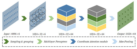 The CA-PointNet++ algorithm takes N × (d + c) dimensional raw point cloud data as input, where N is the number of points, d is the geometric position information, and c is the point cloud feature. The input raw point clouds undergo the first set of abstraction modules for local feature extraction directly. Each set abstraction (SA) module consists of a sampling layer, a grouping layer, and a PointNet layer, where the CA mechanism is embedded in the PointNet. For example, as seen in Figure 3, in the first SA module, a fixed number of N/4 distant center points are randomly selected using the furthest point sampling (FPS) algorithm. Then, K points are sampled within the sphere with a radius r centered on each center point using the ball query, which divides the point clouds into N/4 overlapping small regions. The input data dimension is then transformed into N/4 × K × (d + c), which is used as input for the PointNet to complete shallow feature extraction of the local area point clouds, with an output dimension of N/4 × 64. It should be noted that the CA module is embedded in the aforementioned PointNet structure. The input of PointNet is processed by Multilayer Perceptron (MLP) to extract high-dimensional features, resulting in N/4 × K × (d + c) dimensional data, which is then fed as the input of the CA module. After undergoing a series of transformations, the CA module obtains important features and their positional relationships, followed by local max pooling of the output to obtain local global features. Similarly, the extracted local features are combined with coordinate information and further grouped into larger units as input for the next SA module to generate higher-level features until the global features of the entire point set are extracted. For the segmentation task of CA-PointNet++, the encoder consists of four SA modules, with the data dimension changing from N × (d + c) to N/4 × 64, N/16 × 128, N/64 × 256, and N/256 × 512, respectively, constituting an iterative multilevel feature learning process.