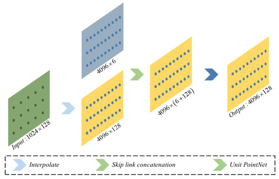 Similarly, for the segmentation task, the decoder part consists of four feature propagation modules, each of which is composed of an interpolation layer, a skip link concatenation layer, and a unit PointNet layer. In each feature propagation (FP) module, the point features are interpolated to the target points using the inverse distance weighting (IDW) method. The shallow features are then calculated based on the deep features of each point in the current network, i.e., the features of N1 × (d + c) points are transferred to Nl-1 points, where Nl-1 and N1 are the number of points before and after downsampling by the SA module, respectively. Based on this, the interpolated features and the output features of the corresponding set abstraction layer are fused using skip link concatenation and then fed into PointNet to obtain new features. After four cascaded feature propagation modules for upsampling, the final classification results for each point are obtained, thus accomplishing the semantic segmentation task. Figure 4 shows the specific structure of the last FP module. For the CA-PointNet++ model that performs the segmentation task, after four cascaded FP modules, each point’s classification result is obtained, ultimately achieving semantic segmentation.