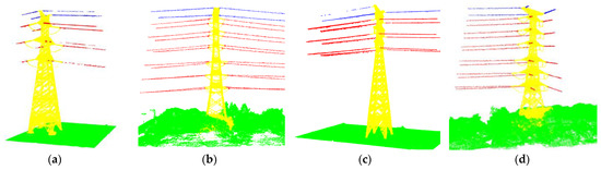 In this study, the DJI M300RTK flight platform was used in conjunction with the integrated Livox L1 LiDAR module to obtain point cloud data of power transmission corridors. 3D point cloud data for the transmission corridors located in Wuxi, Jiangsu Province, Xiangyang, Hubei Province, and Bazhong, Sichuan Province, were collected. The collected LiDAR data included 3D coordinate information for the points as well as their RGB color information. The data covers both double-circuit and quadruple-circuit transmission lines with voltage levels of 110 kV and 220 kV and tower types including straight-line towers, tension towers, angle towers, and terminal towers. The majority of the transmission corridors are located in plain areas. Considering that there are almost no houses, railways, etc. in the collected point cloud data of the transmission corridors, to meet the demand for digital twin reconstruction of transmission corridors, the point clouds were classified into four categories: towers, transmission lines, ground wires, and ground. Trees and other objects that are connected to the ground were classified as ground surfaces without further division. The dataset was labeled using the open-source software CloudCompare, and Figure 5a–d shows the rendered image with labeled color information of the transmission corridors.