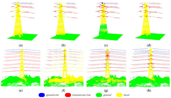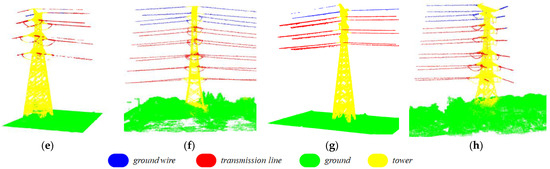 Comparison of the results of semantic segmentation of transmission corridors using CA-PointNet++. Subplots (a–d) show the ground truth segmentation renderings of test areas I–IV, respectively, while subplots (e–h) show the corresponding predicted segmentation results, respectively.