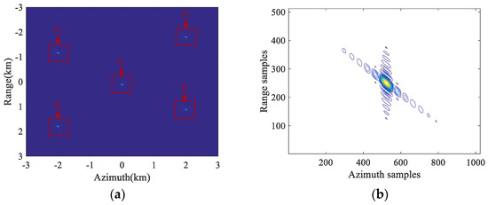 To verify the effectiveness of the azimuth signal processing method of the proposed SBV-PRF squint sliding spotlight mode, the simulation experiment of a point target is executed in this section. The simulation parameters are shown in Table 1. Firstly, an imaging scene containing five-point targets is set up, as shown in Figure 7.