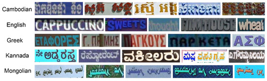- Shi, B.; Yao, C.; Zhang, C.; Guo, X.; Huang, F.; Bai, X. Automatic script identification in the wild. In Proceedings of the 2015 13th International Conference on Document Analysis and Recognition (ICDAR), Tunis, Tunisia, 23–26 August 2015; pp. 531–535. [Google Scholar]