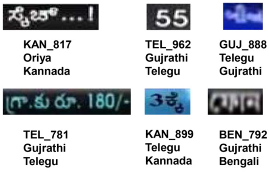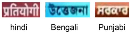 Script identification technology plays a vital role in the Optical Character Recognition (OCR) recognition process [4]. Its greatest significance is that it can help to identify the corresponding language, and further select the best text recognition [5,6,7] model to realize multilingual automatic processing. Script identification can help people better process text information involving multiple languages and improve the efficiency and accuracy of information processing. Script identification in natural scenes refers to the identification of different language types such as the language or dialect to which the text belongs in the real world, so as to perform related processing and analysis. Different script categories include Arabic, Hindi, Bengali, and Telugu, among others. As shown in Figure 1, different scripting languages have different character structures. Script identification encounters significant challenges when dealing with scene text images, which differ significantly from document print [8] images for the following main reasons:
