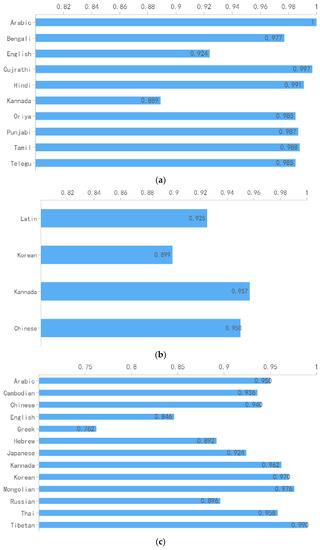 The identification rate of each language on the public dataset SIW-13 is shown in Figure 9c, which shows that Tibetan has the best identification performance, reaching an identification rate of 99%. Greek has the lowest identification rate of 76.2%, followed by English, Hebrew, and Russian, which are all lower than 90%. The identification rate of other languages is higher than 90%, and the identification rate of six languages is higher than 95%. Compared with other datasets, the background of this dataset is more complex, and there are more languages with similar or shared characters, which is more difficult, so the identification rate of some languages is lower. The confusion matrix on SIW-13 is shown in Figure 10c. Among the misidentifications of the Greek language, the Russian language is identified most, because some characters are shared in the two language families and the language similarity is very high. Some script characters are too short, and there are no unique language characters for each language, so it is difficult for humans to correctly identify them. Among the English identification errors, 35 images were identified as Thai. The reason is also the problem of character similarity, and the content of some Thai scripts are English scripts. There may be errors when building a dataset to classify script images. Tibetan has the least identification error samples, with 5 images, followed by Chinese and Mongolian, and the identification error samples are no more than 15 images. We achieved an overall identification rate of 92.4% on this dataset.