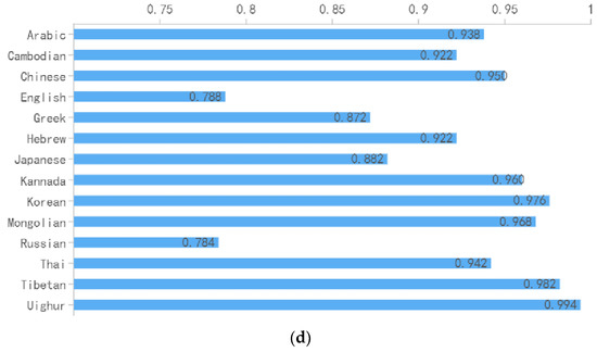 Classification performance on public datasets and extended datasets. The abscissa and ordinate, respectively, represent the identification rate of the language and the category of each language. The longer the abscissa, the higher the identification rate of the language. (a) CVSI-2015, (b) MLe2e, (c) SIW-13, (d) SIW-14.