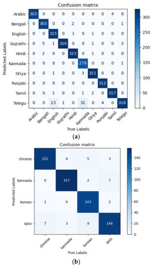 The experimental results for the public dataset MLe2e are shown in Figure 9b. Compared with other datasets, the type and quantity of the MLe2e dataset are relatively small, which is not conducive to the training and convergence of deep learning, and the learned language feature information is not comprehensive enough. Therefore, although there are relatively few languages, there are four languages in total, the experiment still did not achieve a very ideal identification effect. Kannada has the highest identification rate at 95.7%, followed by Chinese at 95.0%, and the worst at 89.9%, which shows that the identification effect is relatively stable, basically reaching more than 90%. This is shown in the confusion matrix in Figure 10b. Seven of the Chinese images were incorrectly identified, that is, most of them were identified as Latin. Because some of the Chinese images contained Latin numbers and letters, they were mistaken for Latin. The vast majority of Korean identification errors are misidentified as Latin and Chinese, which has a lot to do with the similarity of numbers and characters. Among them, the number of identification error samples for Chinese and Kannada is no more than eight images. The identification effect of this method for Chinese, Kannada, Korean, and Latin is generally better, and the key feature information of each language can be obtained for identification. We achieved an identification rate of 93.5% for the entire test set on this MLe2e dataset.