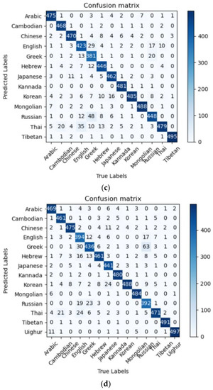 For the performance on the extended dataset SIW-14, the identification accuracy of each script is shown in Figure 9d, and the corresponding confusion matrix is shown in Figure 10d. Due to the particularity of the characters in the Uyghur scene script image, the clear strokes of the image, and the light background noise, its identification rate has reached an astonishing 99.4%, and almost all the feature information of this language has been learned for accurate identification. For other languages, the identification rate of English is still low at 78.8%, and the identification rate of Russian has declined compared with the SIW-13 dataset. It may be that after the expansion of the Uyghur script, there was interference in the judgment and identification of the extracted feature information of the Russian script, so the identification rate decreased. The most misidentified samples of Russian language are Greek, which accounts for the vast majority of misidentified languages. In the same misidentified sample of Greek language, there are 23 script images, that is, most of them are misjudged as Russian. The reason is that the two languages share characters that lead to a high similarity, and some script image samples cannot be correctly identified by the human eye, so it is easier to identify errors. The overall identification rate of our extended script dataset SIW-14 is 92.0%.