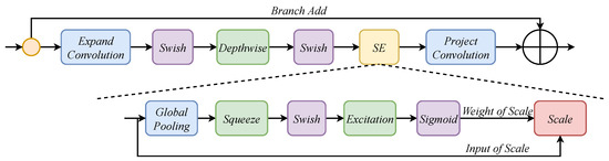 EfficientNet series models, one of the best lightweight CNNs, consist of the parameterized mobile inverted bottleneck convolution (MBCONV) module with the squeeze-and-excitation (SE) module, which is shown in Figure 1. Expand Convolution, Squeeze, Excitation and Project Convolution are 1 × 1 standard convolutions, which can employ multiply-accumulate parallelism along the input channels. Depthwise convolutions in EfficientNet are 3 × 3 and 5 × 5, which do not accumulate along the input channels. It is worth noting that the scale operation in the SE module is equivalent to 1 × 1 depthwise convolution. For ease of presentation, we refer to the datapath before the global pooling as the input of the scale operation and the datapath after the global pooling as the weight of the scale operation, which are shown in Figure 1. Furthermore, if the input size is equal to the output size of MBCONV, the output feature map of MBCONV will add the input feature map in the end, which is called Branch Add.