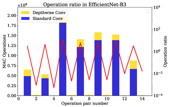 For the separated engine architecture, the standard convolution engine and the depthwise convolution engine will form a pipeline to work. It also needs the balance of MAC numbers of adjacent standard convolution and depthwise convolution. This method, which is used in [16], is more suitable for MobileNetV2 but not suitable for EfficientNet. The MAC numbers of the standard convolution and the depthwise convolution of the first 14 operation pairs in EfficientNet-B3 are shown in Figure 3. We can find that the ratio fluctuates sharply due to the difference between the SE module in MBCONV and other traditional depthwise separable convolutions. The pipeline cannot be formed very well because of the imbalanced workload of two different engines. In a word, both the traditional separated engine and unified engine cannot support EfficientNet series models efficiently.