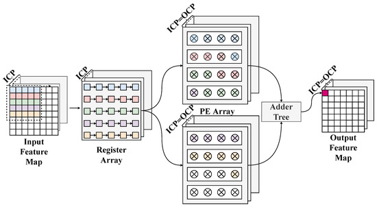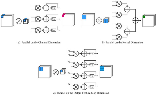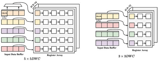 According to the computational characteristics of the depthwise convolution, the 16 × 16 or 32 × 32 computational arrays cannot be paralleled simultaneously on the input channel and output channel dimensions. Three parallel strategies commonly used for DWC are shown in Figure 4.