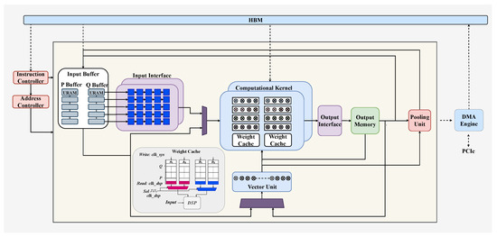 The system hardware architecture of our work is shown in Figure 5, which mainly consists of the instruction controller, address controller, input and output buffer, input and output interface, computational kernel with weight caches, vector unit and pooling unit.