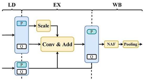 In order to improve the performance of hardware, we need to introduce the ping-pong buffer and pipeline each process of the hardware accelerator according to the on-chip memories. The pipeline of the accelerator can be divided into three levels: data loading (LD)→ execution (EX)→ data writing back (WB). The pipeline architecture of the proposed hardware accelerator is presented in Figure 6. Each round of computation performs a convolution operation of a data block and produces the intermediate or final results. According to the MBCONV structure in Figure 1, the scale operation before the convolution, or the nonlinear activation function and the global pooling after the convolution operation, are performed together in the same computation pipeline.