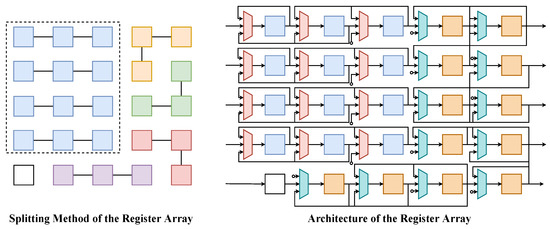 According to Equation (11), the number of clock cycles of EX is more than that of LD or WB. This means that the processes of LD and WB will not block the EX process during the 5 × 5 DWC. In addition, we need to note that 3 × 3 DWC accounts for the larger proportion in lightweight neural networks. During the 3 × 3 DWC, if only nine registers are used in a register array, more than half of the registers will be idle, and the parallelism of the input channel can only reach 16. This will lead to a loss of the utilization of hardware resources of FPGA. If the 2D register array of 5 × 5 can be split into two groups of 3 × 4 register arrays according to the splitting method of Figure 8, only one white register will be idle. The blue registers are the first group of the 3 × 4 register array, and the other colors together form the second group. Each three registers of the same color will form a register chain. At this time, the parallelism of the channels of 3 × 3 DWC will be increased by two times compared with the original architecture. Therefore, we can implement these two types of depthwise convolutions with two different channel parallelisms efficiently by configuring the register array. Another advantage of this design is that it can provide the bidirectional data transmission ability for 3 × 3 DWC, further avoiding cycle waste caused by the register chain during changing rows of input feature map.