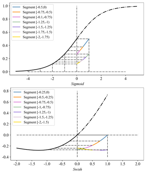 All the values in the domain of the function can be obtained according to Equation (16) by computing the value of the negative axis of the nonlinear function. After the piecewise linear approximation of the negative semi-axis nonlinear function, the slope k and intercept b of each segment of the approximate linear function can be obtained; then, the approximate value of the nonlinear function can be obtained. The segmented approximations of Swish and Sigmoid in EfficientNet are shown in Figure 9.