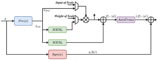 The module made by the XOR gate is designed to implement the . The module is designed to generate 0, 1 or x. The and are made by LUT and store the slopes and intercepts of the NAF. Finally, the module is designed to generate . While computing the NAF, the input ports of the multiplier are k and x. However, while computing the scale operation, the ports of multipliers are the input and weight of the scale operation.