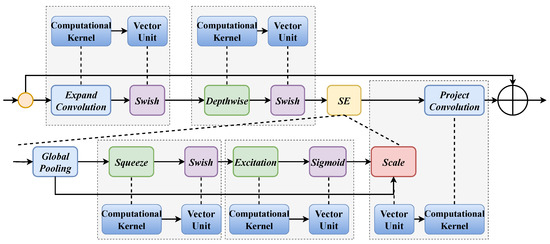 In addition, in contrast to the traditional lightweight convolutional neural networks, there is a special SE module both in the latest EfficientNet series models and MobileNetV3 [5]. The scale operation in the SE module can be equivalent to the depthwise convolution with a 1 × 1 kernel. Although the computation number of the scale operation is not large, it is difficult to make full use of it on the existing computational arrays such as 16 × 16 and 32 × 32. The multiplication number of the scale operation is . The number of multiplications of project convolution after the scale operation is . It is worth noting that is usually six or four times as much as .