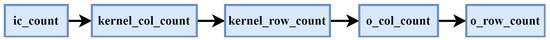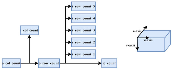When the input data are read from the on-chip buffer to the register array, a data-read counter, which is shown in Figure 13, is designed to determine the address of pixel in the data block. Firstly, according to the column coordinate (x-axis) of the pixel on the output feature map (o_col_count), the column coordinate of the input feature map pixel (i_col_count) to be read in the on-chip buffer is determined. Then, according to the row coordinate (y-axis) of the pixel on the output feature map (o_row_count), the row coordinates of the pixels in four or five rows of IFM (i_row_count_1∼5) to be read are determined. Finally, the channel coordinate (z-axis) is generated. Four or five sub-memories will send data simultaneously to the register array during the DWC. The i_row_count corresponds to a row_addr in each sub-memory. The data-read address in each sub-memory is presented in Equation (21), where W is the width of the input feature map and IC is the numbers of input channel groups.