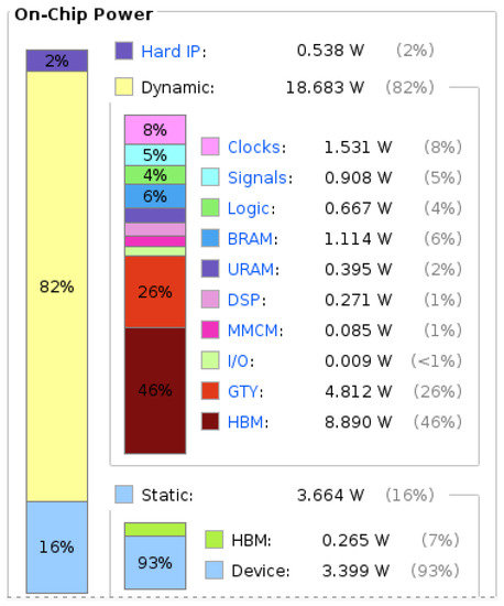 This section evaluates the performance, throughput and resource utilization of our work. Firstly, we quantize the EfficientNet-B3 in terms of INT8 precision, and the experimental result on ImageNet validation set shows that the top-1 accuracy is 80.82%, which is 0.82% lower than the accuracy of FP32 in [7]. This means that the quantization method of this paper is feasible. Next, the complete hardware accelerator is implemented on Xilinx XCVU37P by Verilog HDL. The frequency of the main system is 300 MHz, and the frequency of the DSP kernel is 600 MHz. The resource utilization of our whole hardware system is shown in Table 1, and the power estimate of our hardware system by Vivado 2021.2 is presented in Figure 15, which shows that the dynamic power of our work is 18.683 W.