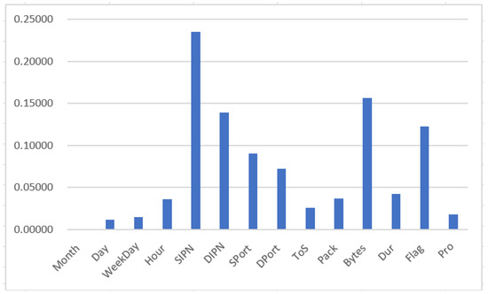 Random forest classifier is used to explore the features importance based on mean decrease in impurity (MDI). The calculation for a given feature’s importance involves summing the number of splits that incorporate the feature across all trees, proportional to the number of samples that it splits. Figure 1 shows the highest numerical features of the UGR’16 dataset based on MDI value. In the proposed model, all the features are included in the process, being the most important feature is the Source_IP.