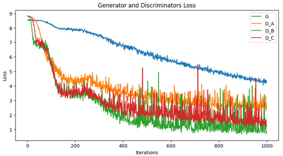 The loss function of G: generator, D_A: first discriminator, D_B: second discriminator and D_C: third discriminator in the TDCGAN model.