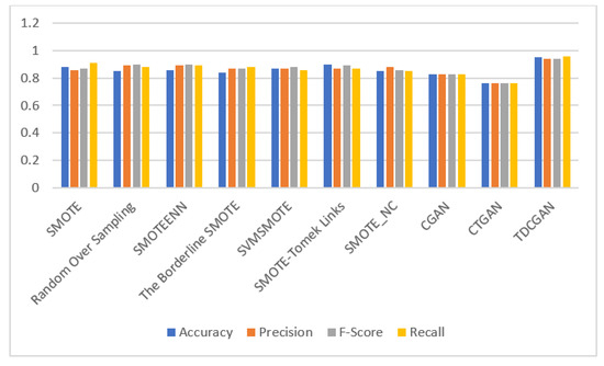 We compare the performance of the TDCGAN model for data balancing on the testing dataset with some resampling methods. The methods are as follows: (1) The synthetic minority oversampling technique (SMOTE) is a method for oversampling that produces artificial instances from the minor class. Its purpose is to create a training set that is either synthetically balanced or close to balance in terms of class distribution, which is subsequently utilized for classifier training. We use the implementations provided in the imbalanced-learn Python library, which provides a range of resample techniques that can be combined for evaluation comparison. (2) Random oversampling is used, which randomly duplicates the instances from the minor class. (3) Then, we combine SMOTE with edited nearest neighbor (ENN) SMOTEENN. (4) With Borderline-SMOTE (oversample technique using Borderline-SMOTE), the minority instances which are near the borderline are oversampled. (5) SVMSMOTE combines the support vector machine (SVM) with SMOTE. (6) We oversample using SMOTE-Tomek Links. Tomek Links denotes a technique used to detect pairs of closest neighbors within a dataset that exhibit dissimilar classes. Eliminating either one or both instances from these pairs, particularly those from the majority class, results in a reduction in noise or ambiguity within the decision boundary of the training dataset. (7) SMOTE_NC (synthetic minority over-sampling technique for nominal and continuous) is used to oversample data with categorical features. (8) CGAN (conditional generative adversarial network) is a conditional GAN that generates data under a conditional generation. Lastly, (9) CTGAN (conditional tabular generative adversarial networks) models tabular data using CGAN. The results are listed in Table 6 and shown in Figure 4.