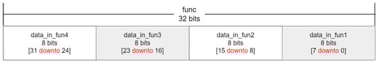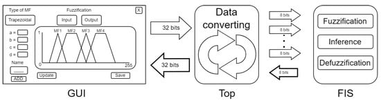 TOP is the stage programmed in VHDL code and is the connection between GUI in C/C++ and the FIS. The FIS in VHDL receives variables with different bit sizes that are joined into a bus of 32 bits. The first bus from the GUI is called func. This bus is used for the three parameters of the triangular MF or four parameters for the trapezoidal MF and is the union of four variables, as shown in the Figure 3.