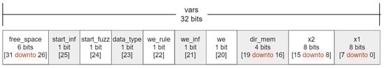 The second bus is vars which contains nine variables to use in the FIS. This bus has 6 bits empty, the free space is to complete the 32 bits of the bus. Figure 4 shows the diagram of vars. In this case, vars contains the flags to start fuzzification (start_fuzz), read or write the MFs of the inputs (we_fuzz), start inference (start_inf), read or write the MFs of the output (we_defuzz), read or write the rules (we_rule), MF type selection (data_type), or choose the stored rules (dir_mem). It also has the values of the inputs (x1, x2).