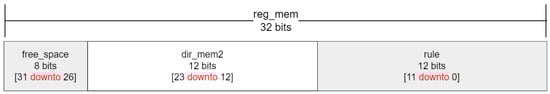 The third bus is reg_mem which contains two variables to use in the FIS, and one empty variable with 8 bits, as shown in Figure 5. In addition, reg_mem contains a 12-bit memory address pointer for the rules (dir_mem2) and another 12 bits to save the rules (rule).