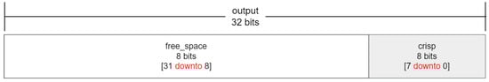 The last one is the bus output. This bus, unlike the others, receives the crisp value from the FIS in VHDL code and after it is sent to the GUI, the bus output has 24 bits of free space because the crisp value only has 8 bits, as represented in Figure 6.