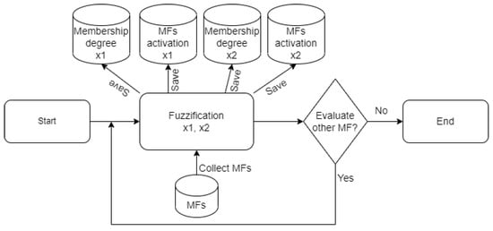 Fuzzification: The first stage of the FIS is when the tool receives the MFs parameters and calculates the membership degree with Equations (2) and (3). The FIS has two linguistic variables x1 and x2 and one output, also the users can add up to 15 MFs for each linguistic variable. The supported types of MFs are triangular and trapezoidal, which are the most common for hardware due their ease of implementation and their simplicity [,]. The process is started when the input called “start_fuzz” is activated. The process consists of a loop with all MFs evaluated with x1 and x2; the results are saved in four registers, two registers for the membership degree to x1 and x2, and other two to indicate which MFs are activated. The activated MFs are used in the Inference stage. Figure 7 shows the process.